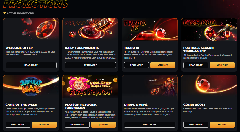 | Instant Casino | 200% up to €7,500 + 10% weekly cashback | 3,000+ (slots, table games, sportsbook) | Credit cards, e-wallets, crypto | Fast payouts and live dealer games |